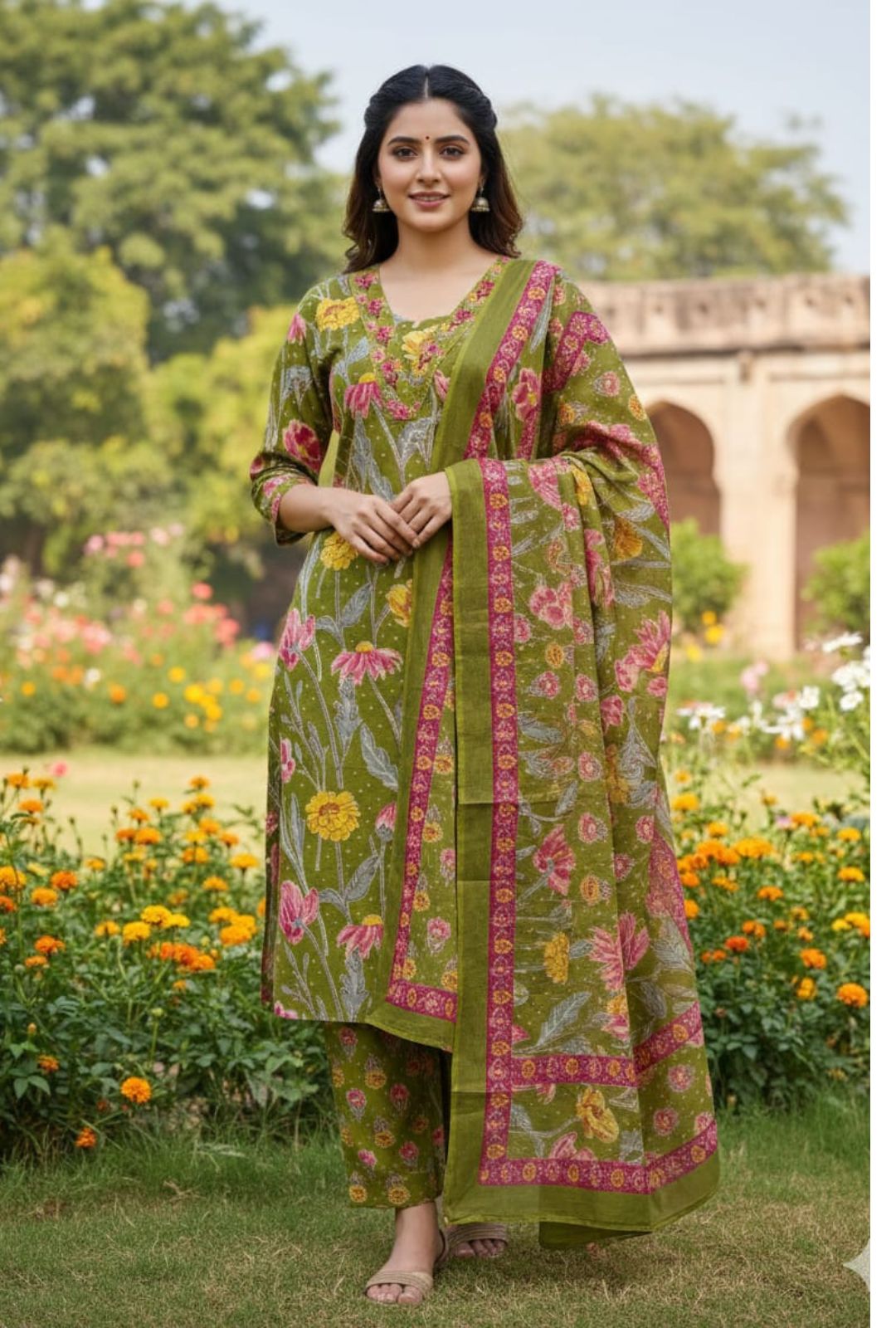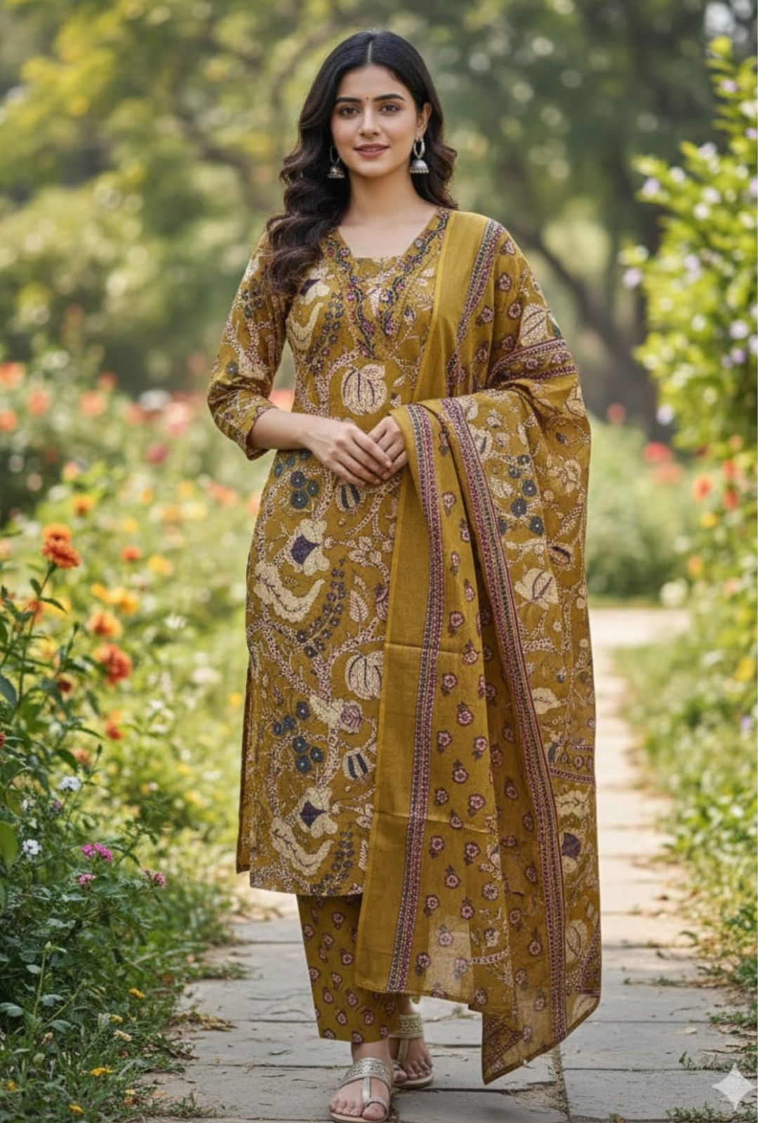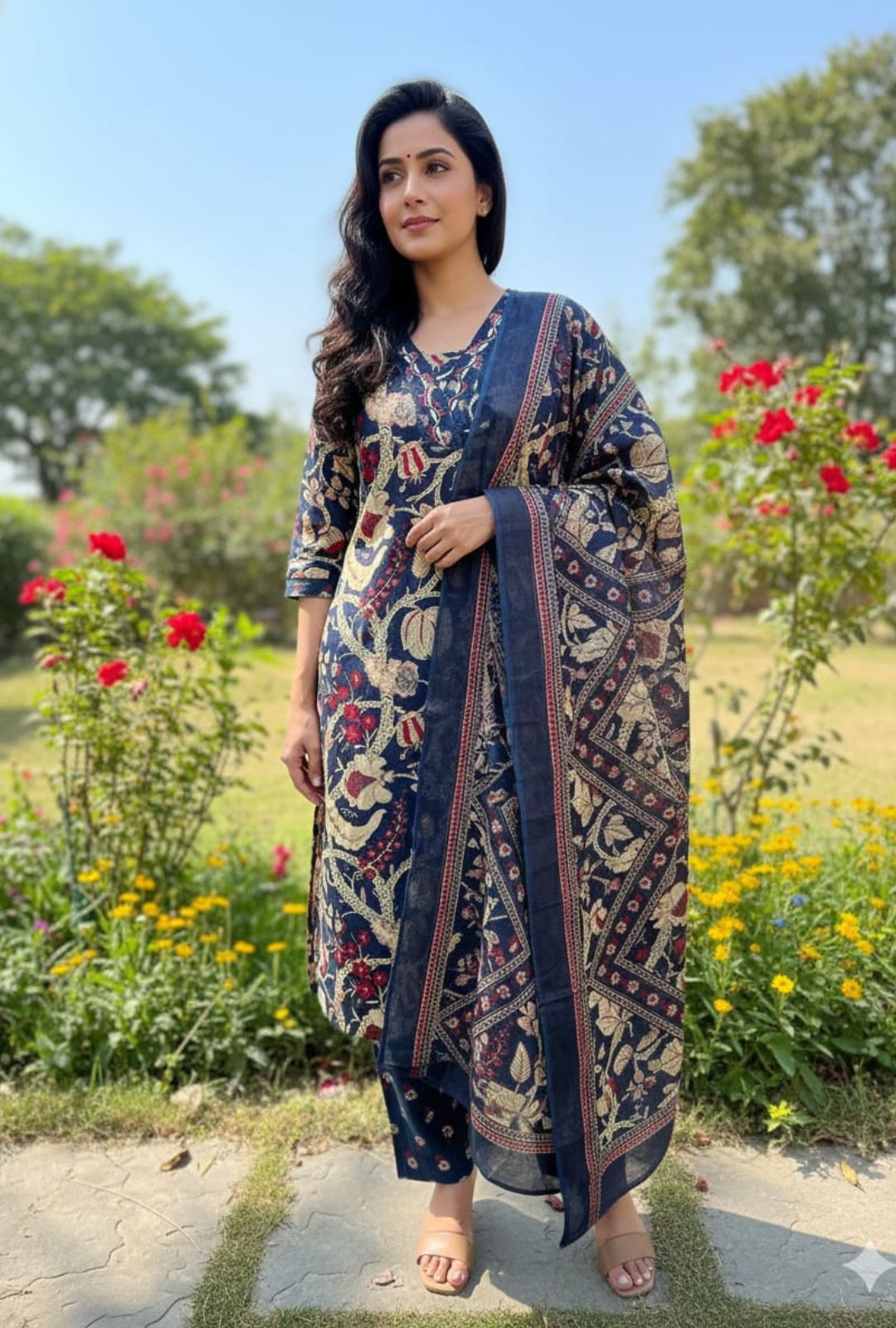 Experience the perfect blend of comfort, quality, and ethnic elegance with this cotton kurti pant dupatta set from Vedikafashions.