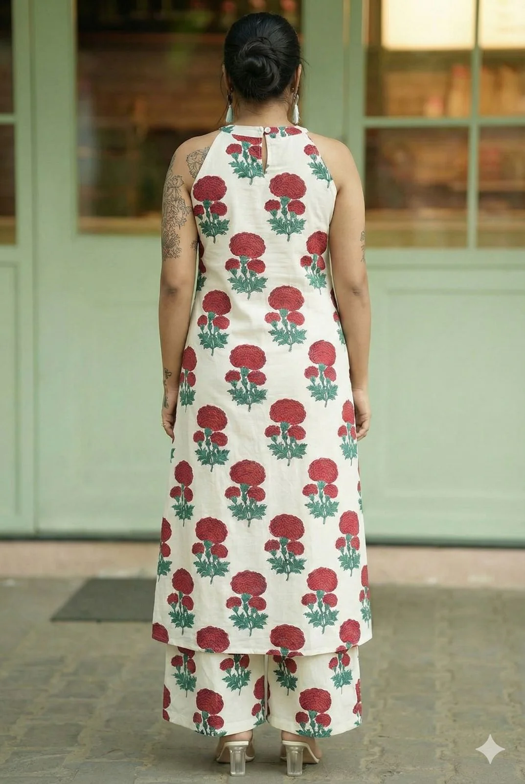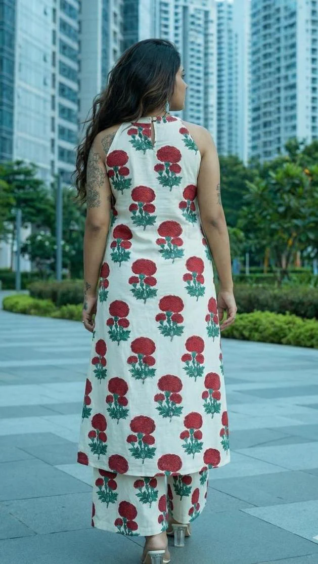 Embrace timeless elegance with this beautifully crafted Halter Neck Kurta Palazzo Set, designed in traditional Jaipuri handblock prints and made from soft, skin-friendly pure cotton. Lightweight and breathable, this ethnic co-ord set ensures all-day comfort while delivering a refined, contemporary look.